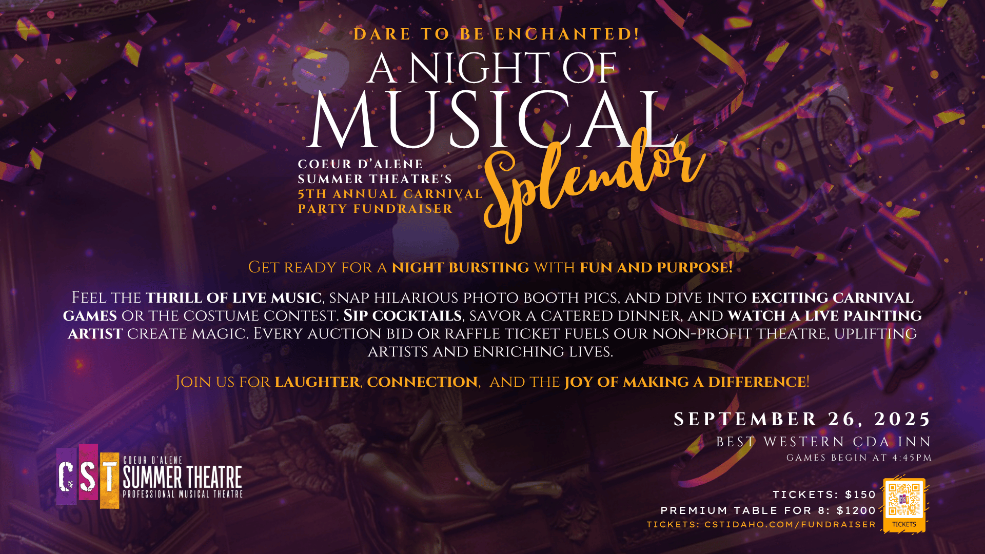 Feel the thrill of live music, snap hilarious photo booth pics, and dive into exciting carnival games or the costume contest. Sip cocktails, savor a catered dinner, and watch a live painting artist create magic. Every auction bid or raffle ticket fuels our non-profit theatre, uplifting artists and enriching lives.